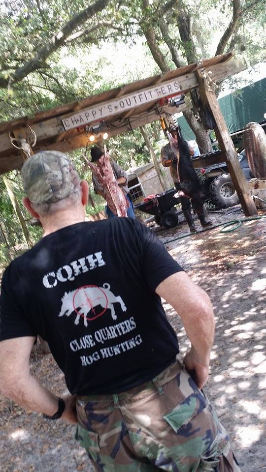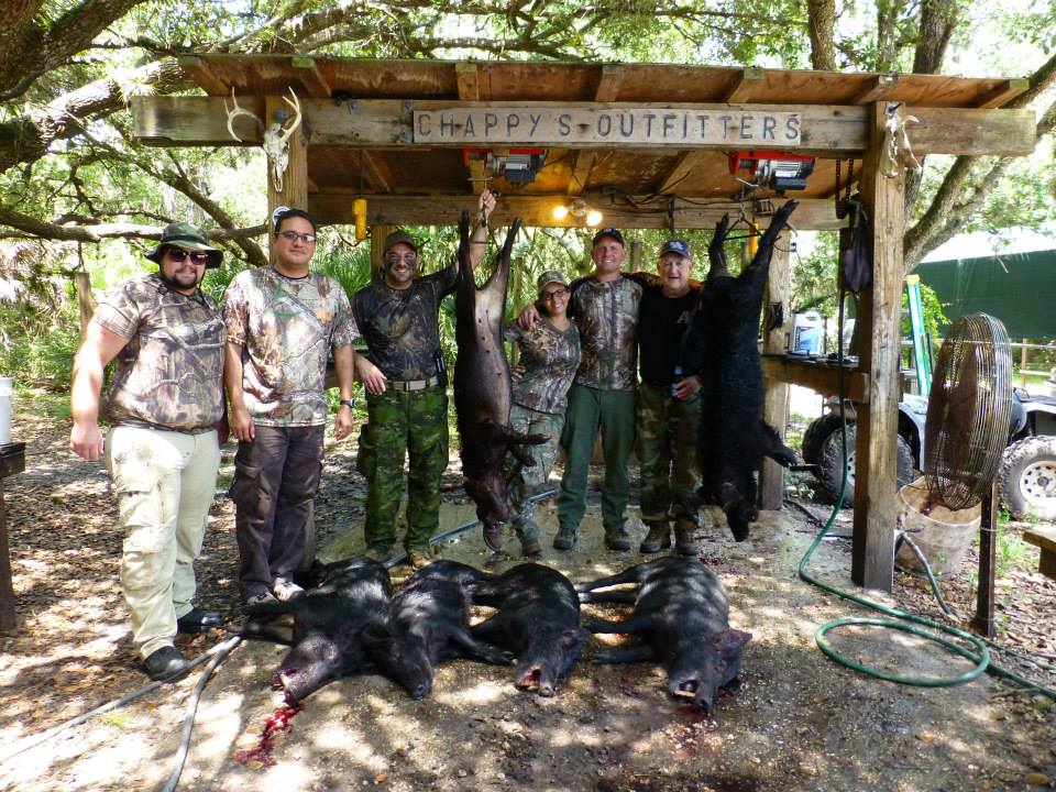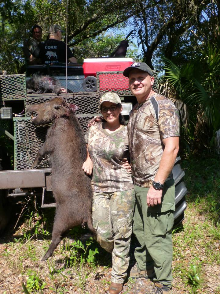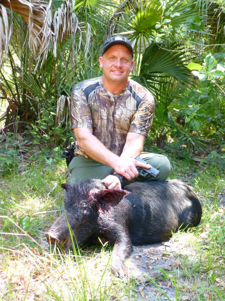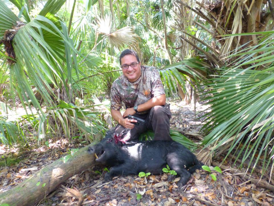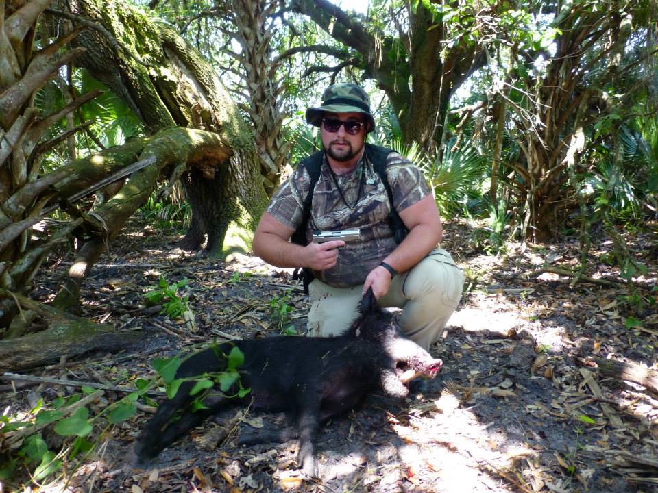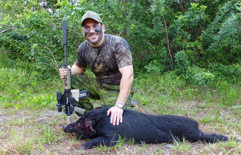 Erik and friends returned to Moore Haven, Florida to bring home more bacon. This was the first time that Erik used his new SilencerCo suppressor on his Spikes Tactical AR Carbine in .556/.223 with a 1:7 twist, topped with a 4x Trijicon ACOG. If anyone doubts that .223 is not sufficient to kill a hog, these pictures prove otherwise. Erik reported that the suppressor did its job flawlessly as well. At the end of the day, everyone -including a number of first timers – had a great time and got a hog. If you’re interested in getting a suppressor, please stop by our store and we can help guide you through the process. May 2015.